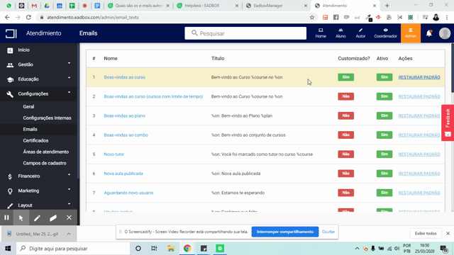 No menu Configurações > Email é possível customizar, ativar ou inativar o disparo desses e-mails e restaurar para o texto padrão caso necessário. Este painel também informa se o e-mail automático foi customizado ou não.