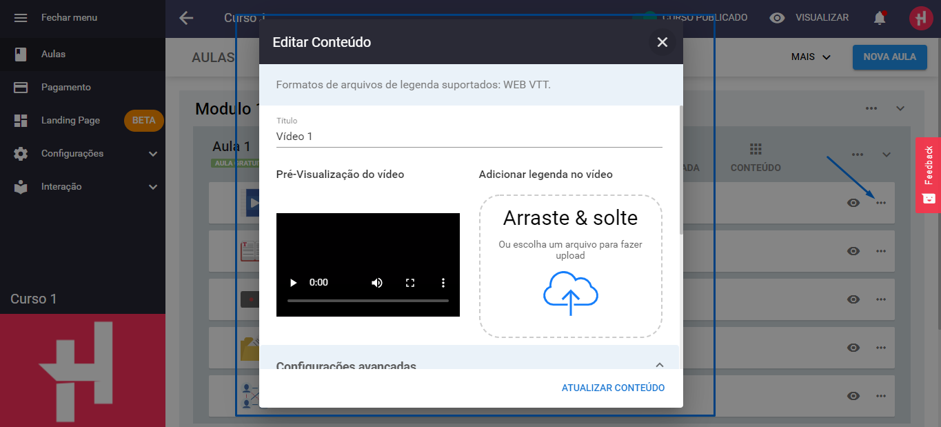 Após a criação do conteúdo permite alterar o nome, visualizar limitar as visualizações, configurar como conteúdo extra, opção de download, colocar legendas no formato WEB e VTT, nas configurações avançadas.