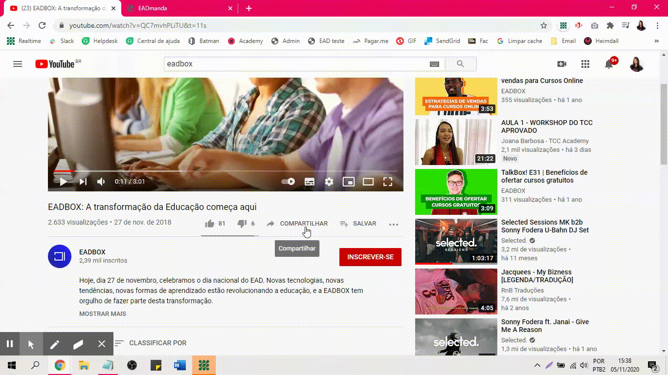 Inserir um vídeo em HTML, No YouTube, para obter o código clicando em "compartilhar" e em seguida "incorporar". Copiar código iFrame que pode ser inserido no leitor de HTML.