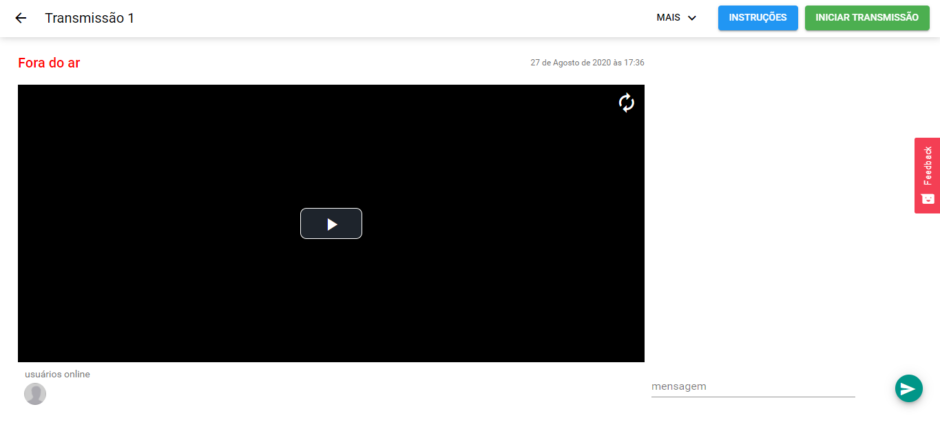 - Importante: Para realizar a transmissão ao vivo, é necessário utilizar um software externo, como OBS Studio, Zoom, Xplit, etc. Mais informações sobre o assunto você pode conferir aqui.
