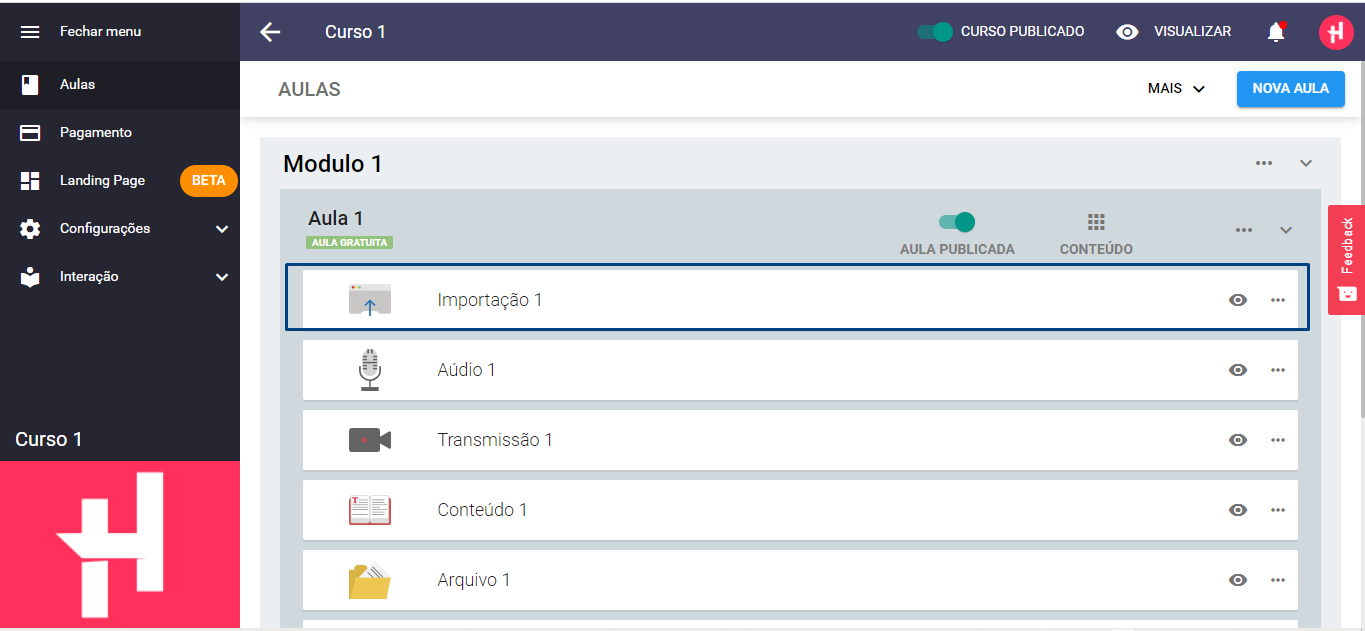 Entrando em um curso, dentro da aula, temos a seção onde podemos adicionar todos conteúdos e combiná-los.