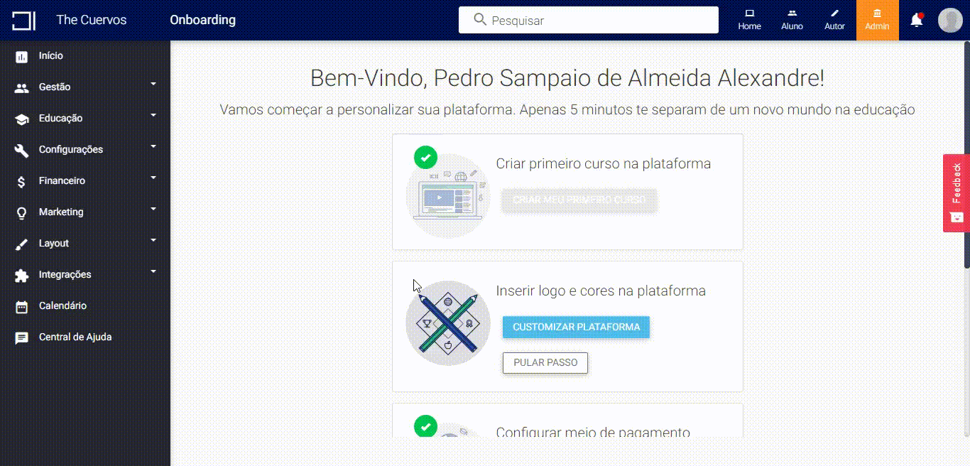 Primeiro é necessário acessar o menu Educação e clicar no curso que deseja configurar o preço. Em seguida, acesse o menu Pagamento e pronto, agora você está o local ideal.